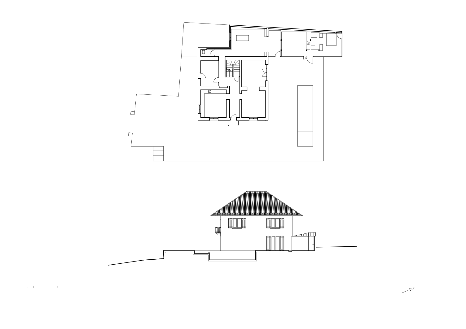 Installée sur le versant Est du massif des Bauges, cette propriété savoyarde cerclée de murs de pierre, bordée par le ruisseau de Verrens-Arvey fait face au massif du Grand Arc. Le projet agit d’abord sur la mise en valeur des petits murs de soutènement existants autour du corps principal de la maison qui deviennent le socle de notre intervention. Nous souhaitons offrir un balcon, un belvédère suspendu au dessus de la vallée. La présence de l’eau, perceptible avec le bruit du torrent, est l’autre élément majeur du projet. Ainsi, un bassin d’agrément compose le plan du rez-de-jardin. Sa surface immobile reflète les lointains et le ciel en écho à la longue façade vitrée de l’un des gîtes qui ferme ce lieu unique d’une grande quiétude.